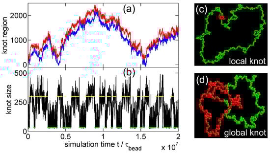 (a) The start (red line) and end (blue line) positions of a knot along a circular flexible chain in a simulation with the parameter set {A triangle potential, , = 10, }. The positions are occasionally offset by to make both curves continuous. (b) The number of beads in the knot core as a function of the simulation time calculated from the top graph. The green and yellow lines indicate the most probable sizes of local and global knots, respectively. (c,d) are snapshots in this simulation, with the knot region denoted in red and the unknotted region denoted in green.