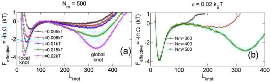 (a) Effective potential as a function of the knot size for various strengths of triangle potentials obtained from simulations with fixed and fixed = 10. (b) Effective potential as a function of the knot size for various sizes of ring chains obtained from simulations with fixed and fixed = 10.