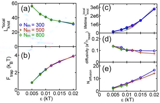 Results from simulations with parameter sets {a circular chain, = 300, 500 or 800, a triangle potential, }. (a) Metastable size of local knots. (b) The depth of potential well around local knots. (c) The lifetime of local knots in units of . The gray curve is calculated from Equation (7). The data for is incomplete at large due to an insufficient number of hopping events in simulations. (d) The diffusivity of a knot along the chain. The calculation of diffusivity is based on all data, including both tight and loose knots. (e) The normalized diffusion distance along the chain during the lifetime calculated from Equation (9).