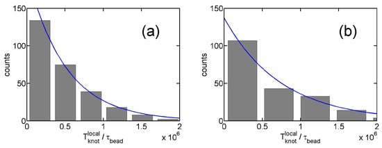 From the stepwise evolution of knot size, we can calculate the dwelling time of a knot trapped in the potential well around local or global knots. Figure 5 shows the histogram of . The distribution of dwelling time appears to follow an exponential decay,