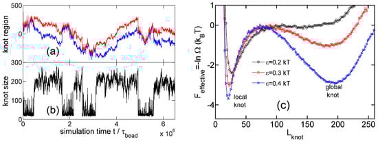 Now we study knot breathing in a semiflexible chain with a Yukawa potential. Figure 6a,b shows an example of the diffusion of a trefoil knot along a circular chain. We use a weak bending stiffness , because a larger requires a chain with more monomers to eliminate the finite-length effects and accordingly requires more computational efforts. We use a Yukawa repulsion with and = 0.4 to moderately squeeze the knot size to . Simulation snapshots of tight and loose knot conformations are presented in Figure 7. From the distribution of the knot size, we calculate the effective potential as a function of the knot size as shown in Figure 6c. The traps around local and global knots becomes deeper as the Yukawa potential becomes stronger.