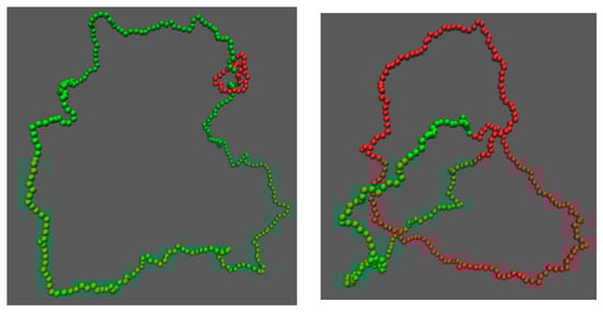 Simulation snapshots of the local knot (left) and the global knot (right) from the simulation {Yukawa potential, = 300, = 2.5, = 5, = 0.4 }. The red beads correspond to knot cores, while the green beads correspond to unknotted region.