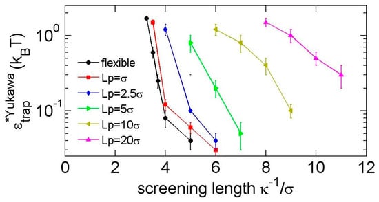 To substantially trap a knot, a minimum strength is required. Figure 8 shows the minimal strengths for Yukawa repulsions. We consider a knot to be substantially trapped if the life time of the local knots is more than 10 times the relaxation time of a local knot in simulations. The leftmost point of each curve in Figure 8 roughly indicates the minimal screening length to trap a knot. Note that repulsion-induced knot trapping is a phenomenon requiring a criteria stricter than repulsion-induced knot shrinking in our previous study [35]. For repulsion-induced knot shrinking, we treat the soft potential as a weak perturbation and judge the trend of around . Recall that < 0 corresponds to the repulsion-induced knot shrinking, while > 0 corresponds to the repulsion-induced knot swelling. Sometimes, will switch from a negative value to a positive value as we increase from zero to a finite positive value. Under that situation, we cannot trap a knot by repulsion. For repulsion-induced knot trapping, we use a finite repulsion to substantially trap a knot. Both repulsion-induced knot shrinking and repulsion-induced knot trapping require a sufficiently long-range interaction. In the case of flexible chains, the minimal screening length for repulsion-induced knot shrinking is , while the minimal screening length for repulsion-induced knot trapping shrinking is . It means that, in the case of , the knot will shrink and then swell as we increase the strength of repulsion from , and we cannot substantially trap a knot.