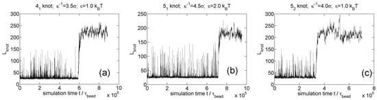Figure 2 shows a typical simulation where a knot switches between tight conformations and loose conformations. We use a flexible chain with a triangle potential to speed up this simulation. For a flexible chain with a triangle repulsion, the critical interaction range for repulsion-induced knot tightening was determined as in our previous study [35]. Here, we set , which is much larger than . We set the strength of the triangle potential as such that the tight knot is moderately trapped.