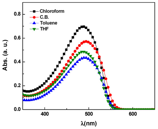 Figure 1 illustrates the absorption spectra of MDMO-PPV at fixed a concentration of 10−2 mg/mL in various solvents. It can be noted that the absorption peak shifted slightly with variation in the type of the solvent. The absorption peak of MDMO-PPV in the aromatic solvents, which have the lowest polarity as mentioned in Table 1, is around 493 nm whereas it is at 486 and 488 nm for chloroform and THF, respectively. This observation can be attributed to the change in the polarity of the solvent, where the absorption peak slightly red shift with decreasing the solvent polarity.