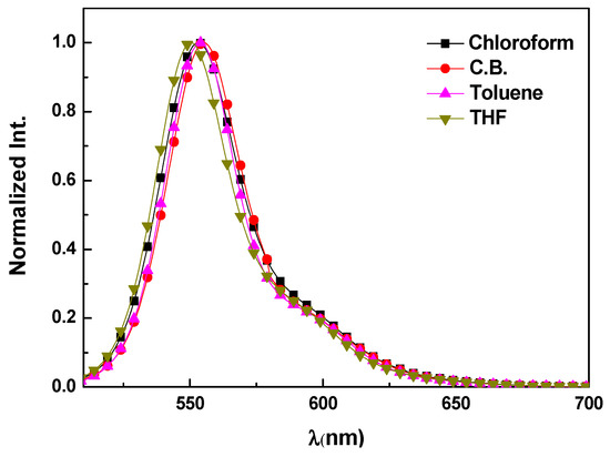 The solvent effect on the fluorescence spectra of MDMO-PPV (10−2 mg/mL) was investigated with different solvents, as shown in Figure 2. Two peaks are observed due to 0-0 and 0-1 transitions. The 0-0 transition is located at 555, 554, 553, and 550 nm for CB, toluene, chloroform, and THF, respectively. The 0-1 transition appeared close to 585 nm, which can be attributed to the formation of aggregated species where there fluorescence is roughly the same as the vibronic transition of the isolated polymer chains. It is clearly observed that the aggregation of MDMO-PPV molecules happens more readily in aromatic solvents such as toluene which interacts preferentially with the aromatic backbone of the polymer chain. The nonaromatic solvents such as THF are more likely to interact with the side groups of the polymer, thus, causing the polymer chains to form tight coils and minimize the exposure of the backbone and reduce the formation of aggregates [22]. Consequently, fluorescence spectra are slightly blue shifted in THF relative to other solutions, where the degree of the aggregation is hindered in THF solvent and promoted in toluene solution. This finding is in good agreement with previous studies on another conjugated polymer from the same PPV derivatives, namely poly[2-methoxy-5-(2-ethylhexyloxy)-1,4phenylenevinylene] (MEH-PPV) [23,24].