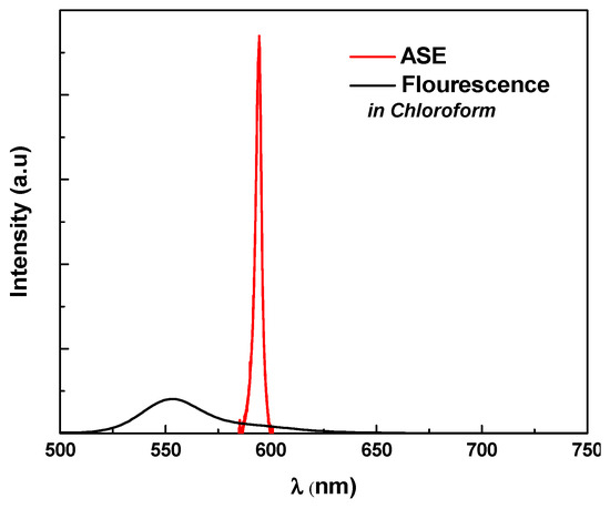 To show the amplified spontaneous emission (ASE) from the MDMO-PPV, the ASE peak must be observed at the range of its fluorescence spectra. For this purpose, the fluorescence and ASE spectra of the MDMO-PPV dissolved in chloroform, as an example, are illustrated in Figure 3. It can be clearly seen that the fluorescence spectrum has two peaks, one at 553 nm and the other close to 585 nm, and the ASE peak is located at 585 nm with narrowed 3.3 nm. This finding means that the fluorescence appears from two vibronic band transitions (0-0, 0-1) and the ASE occurs at the 0-1 transition, which is shown in the ASE from the MDMO-PPV. The existence of the ASE at the 0-1 transition rather than the 0-0 transition may be explained by a higher net gain of the 0-1 peak than that of the 0-0 peak because it is farther from the absorption edge and, therefore, has less reabsorption loss [28,29].