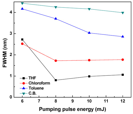 The ASE full width at half maximum (FWHM) of MDMO-PPV dissolved in various solvents at a specific concentration of 0.67 mg/mL is demonstrated in Figure 4. It can be observed that the FWHM of the ASE peak is decreases with increasing pumping energy in all solvents. The narrowest FWHM was for nonaromatic solvents (THF and chloroform), which have the highest polarity compared with that of other aromatic solvents. Once the pumping energy exceeded 8 mJ, the ASE narrowing of the MDMO-PPV in THF and chloroform did not change and subsequently gain narrowing becomes constant. These results stem from the fact that the solvent nature is playing a significant role in producing ASE [29].