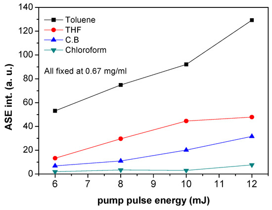 ASE intensity of MDMO-PPV dissolved in different solvents for different pumping energy and a fixed concentration at 0.67 mg/mL.