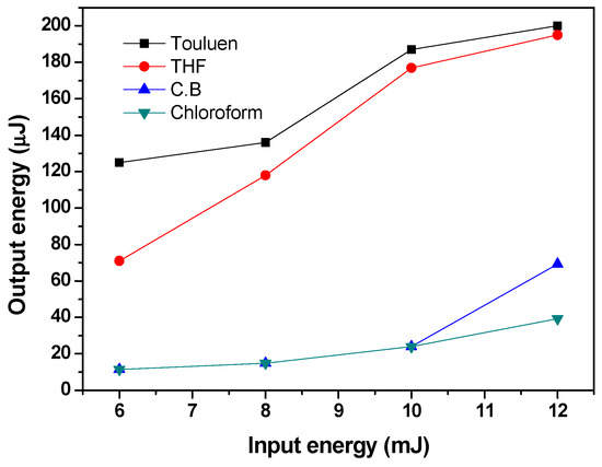 Figure 6 shows the relationship between output and input energy for different MDMO-PPV dissolved in various solvents with a fixed concentration at 0.67 mg/mL. The ordinary linear dependence of the output pulse energy of the polymer solution as a function of the input pulse energy of the Nd:YAG laser can be seen. Moreover, the nature of the solvents has different effects on the Output energy. Toluene is the best solvent which gives the highest ASE efficiency, whereas chloroform is the worst solvent compared with the other solvents. This finding can be ascribed to the highest quantum yield for MDMO-PPV dissolved in toluene and lowest yield in chloroform, compared with other solvents. On other hand, the highest ASE efficiency is due to the fact that toluene has the lowest polarity index, whereas the lowest ASE efficiency in chloroform is due to its high polarity index compared with that of other solvents.