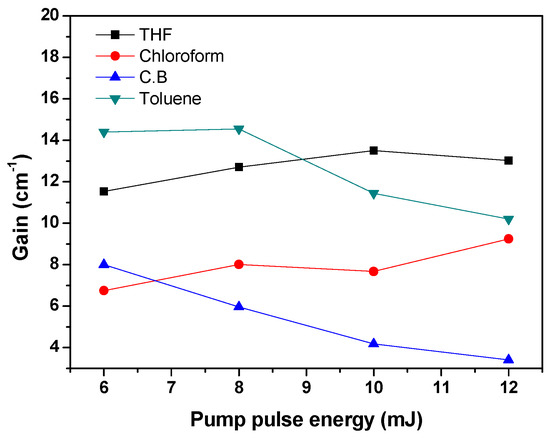 Figure 7 shows the dependence of the ASE gain of MDMO-PPV dissolved in various solvents on pumping energy at a fixed concentration of 0.67 mg/mL. The figure indicates that the optical gain decreases by increasing the pumping energy for MDMO-PPV dissolved in aromatic solvents (Toluene and CB), while it increases by increasing the pumping energy for MDMO-PPV dissolved in nonaromatic solvents (THF and chloroform) which possess a high polarity index compared with that of the aromatic solvents.