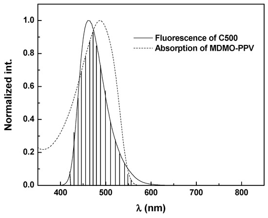 The verification of non-radiative energy transfer conditions between MDMO-PPV as the acceptor and C500 as donor was shown in Figure 8. For this purpose, the MDMO-PPV and C500solutions were prepared in chloroform at a concentration of 10−2 mg/mL and 10−3 mg/mL, respectively. The strong overlap between absorption spectrum of MDMO-PPV and emission spectrum of C500 can be clearly observed. This overlap shows that non-radiative energy transfer from C500 to MDMO-PPV is clearly possible.