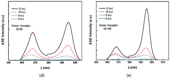 The ASE for energy transfer between the donor and acceptor hybrid was studied under high source Nd:YAG laser excitation (355 nm) and various pump pulse energies ranging from 6 to 12 mJ. As shown in Figure 9, an ASE from C500 occurred at 565 nm in absence of the MDMO-PPV. Similarly, without the donor, there is only one ASE band at 585 nm due to the 0-1 vibronic transition. Both of these findings of the ASE wavelengths are independent on pump power or concentration of either donor or acceptor. However, in the presence of both donor and acceptor with a volume ratio up to 50:50 under various pump powers, the ASE from acceptor disappeared while the ASE is almost totally from the donor at around 565 nm. When the volume ratio exceeded 50:50, the peak of the acceptor appeared with a dramatic decrease in the donor ASE intensity. This means that some of the excitation energy was emitted and the rest was sapped by the acceptor, which is indicative of an extraordinarily efficient energy transfer process from molecules of the C500 to monomers of the MDMO-PPV. Moreover, at higher concentrations of acceptor, i.e., 50:90, two ASE bands appear. The first one is around 565 nm, due to the donor, and the second is around 595 nm, related to the 0-1 vibronic transition of the acceptor. There are two reasons for the red shifting of the ASE peak (from 585 to 595 nm) at the higher content of the acceptor: The first is the absorption of the MDMO-PPV overlaps the short-wavelength side of its fluorescence spectrum. The second is the competition between the stimulated emission mechanism and the energy transfer from the donor to the acceptor [18,31]. Once the volume ratio exceeded 50:90, the ASE peak at 595 nm, which related to the acceptor, became dominant; while the peak of the donor at 565 nm was quenched dramatically. This observation signified that the energy transfer from the C500 molecules to the considerable number of MDMO-PPV monomers was not emitted as fluorescence but converted into heat, and this implies that some of the monomers acted as dark quenchers without any fluorescence [32]. This finding is consistent with previous reports where the ASE was found from the donor for acceptor concentration below 10%, whereas above this ratio, the ASE was from the acceptor [18,31].