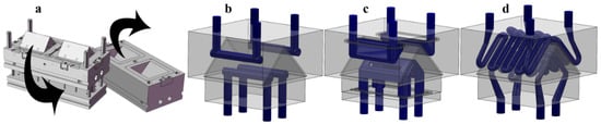 (a) The injection mold block used in the simulations, and the (b) Conventional, (c) Milled, and (d) Conformal cooling systems of the inserts.