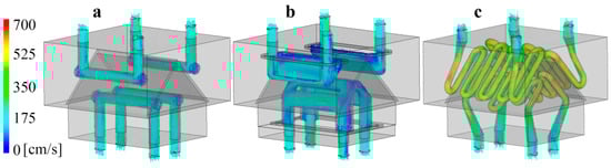 The flow velocity of the coolant (Figure 3) is a very important factor in determining cooling efficiency. The simulation shows significantly different flow velocity values for the different mold inserts. In the conventional mold insert, the coolant stagnates at the corners. This reduces heat transfer and increases the temperature of the stagnant coolant, therefore decreasing cooling efficiency (Figure 3a). In the Multi-part mold inserts, flow speed decreases considerably in several places, thus impairing cooling efficiency (Figure 3b). In the conformal cooling system, a reduction of diameter results in a noticeable increase in flow speed, which doubles the Reynolds number and the heat transfer coefficient (Figure 3c). The layout of conformal cooling circuits ensures that the flow of the coolant is uniform in critical parts of the insert; more coolant flows in these directions, and so the upper edge of the movable mold insert receives more coolant. Another difference between the cooling channels is surface finishing; the laser-sintered DMLS insert has notably higher roughness, which influences the turbulence of the flow. In addition, the cooling channels manufactured by DMLS technology corroded faster.