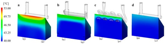 Figure 4 shows the averaged temperature distributions of the center of mold inserts on the moving half. The maximum temperature of the conventional layout (used for reference) exceeds 52 °C at the edge of the insert furthest from the cooling circuits (Figure 4a). The maximum temperature of the mold insert with the milled multi-part cooling circuit is several degrees lower, and its temperature distribution is also more uniform (Figure 4b). In this case, similarly to the conventional mold insert, more heat accumulated at the edge of the insert, as the cooling system cannot transfer enough heat from this spot.