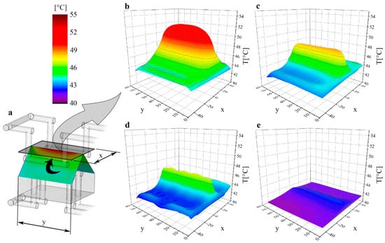 The surface temperatures of the various mold inserts were also evaluated in our investigation. The coordinates of the surface of the mold inserts were transformed into one plane (Figure 5a), and the results displayed in a 3D graph. Thus, surface temperatures can be seen as a function of the x, y location coordinates.