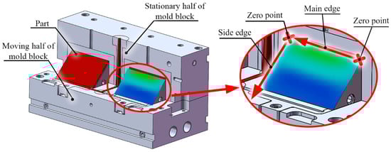 The notations used for the evaluation of the measurements, the side edge near the sprue and the main edge on the top of the moving insert.