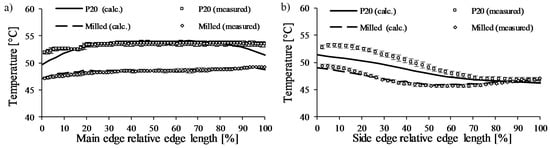 The measured and calculated surface temperature near (a) the main edge and (b) the side edge of the investigated inserts.