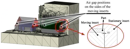 A new model was set up with air gaps between the side faces of the core and cavity inserts (Figure 9). The fitting gap between the two inserts was measured by applying a high viscosity polymer liquid (dynamic viscosity around 600 Pas at room temperature), which provides an adequate contact surface between the inserts. The gap was found to be 0.1 ± 0.02 mm. The modeled gap has the thermal properties of air of 50 °C (Table 4). The thermal properties are temperature dependent, so we used the previously-run simulation to determine the temperature of the air.