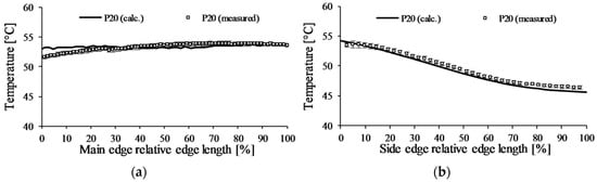 Firstly, the influence of coolant temperature was investigated, and the temperature of the water was changed to 42 °C because the temperature was set to 40 ± 2 °C on the cooling unit. The results of the Ampcoloy insert with the modified coolant temperature show a good correlation between the measured and calculated mold surface temperatures on both the main and side edges (Figure 8). However, for the P20 insert, there is a difference is between the calculated and the measured surfaces temperatures on the sides of the main edge and on the first 50% of the side edge, which can be caused by the incorrect setting of the heat transfer parameters on the sides.