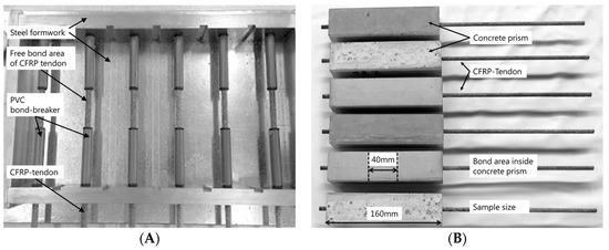 Specimen details: (A) CFRP-tendon and bond-breaker arrangement before casting; and (B) demoulded samples before testing.