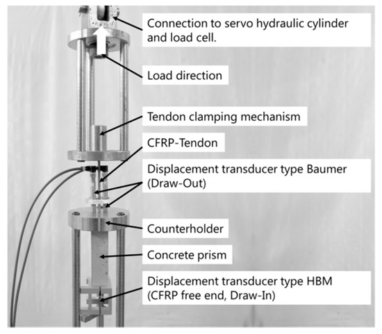 To compare the influence on the maximum bond strength of different parameters, such as sand-coating and tendon stiffness, the proposed experimental set-up in EN10080 Appendix D was chosen and slightly adapted in geometry after considerations in [14,32]. Due to the long un-bonded distance of 60 mm between the counter holder and the 40 mm long bond area in the middle of the concrete prism, it is anticipated that the influence of concrete confinement due to friction at the counter holder is minimal. This was also checked during pilot testing by applying a 0.5 mm thin rubberlike material (ScotchTM VHBTM 4905, 3M, Mapplewood, MN, USA) between the prism and the counter holder during pull-out testing. No effect on tendon draw-in and failure type could be detected. An overview of this pull-out set up is shown in Figure 2. The force was applied by a servo hydraulic cylinder and the tendon draw-in at the load free end was measured by a LVDT of type W2ATK HBM (Hottinger Baldewin GmbH (HBM), Darmstadt, Germany).