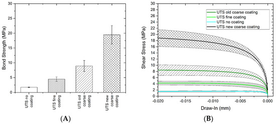 The results show a clear dependency of the maximum bond strength upon the chosen sand coating. No-coating (σu = 1.73 MPa, Stdv = ±0.12) and fine-sand (σu = 4.50 MPa, Stdv = ±0.75) showed the weakest bond performance. A significant increase was reached by the old-coarse-sand (σu = 8.95 MPa, Stdv = ±1.87) and finally the new-coarse-sand (19.47 MPa, Stdv = ±3.11). All bond strength means are significantly different despite the two samples no-coating vs. fine-sand and are visualized in Figure 3A.