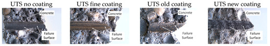 Moreover, the bond area of the four tested surface configurations was investigated visually (see Figure 4). For the two coarse coatings it was found that the sand particles stick together with their corresponding adhesive epoxy resin to the surrounding concrete. This indicates most probably that the overall bond strength is governed by the interface between the sand epoxy adhesive layer and the CFRP tendon’s surface. In the case of the fine-sand coating, the grains were also found to be present onside the concrete prism after the pull-out. However, the fine particles were not anymore completely embedded in their adhesive layer. Thus, the bond strength was dependent on the bond between the fine-sand and the coating epoxy. In conclusion, the new-coarse-sand was identified as the best option and was also applied to the specimens studied in the next sections.
