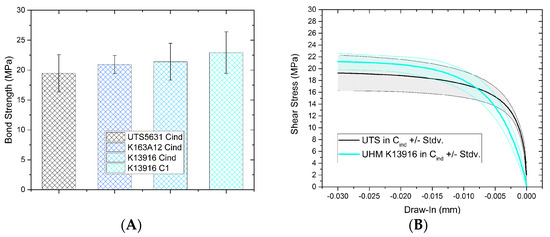 Influence of tendon stiffness on bond (UTS5631 136 GPa, K63A12 463 GPa, K13916 509 GPa). (A) Absolute bond strength comparison. All samples are coated with the new coarse coating and tested in C1 and Cind, respectively. (B) Tendon draw-in behaviour. The sudden drop in load after failure is cut-off from the graphs to allow a better visualization up until failure.