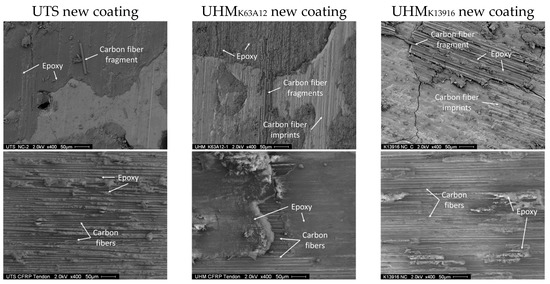 Similar behaviour during loading was observed for all tendons. A continuous load increase until the maximum bond strength was followed by a sudden tendon slip-out failure. The maximum bond strength of all tendons (σu_K63A12 = 21.08 MPa, σu_K13916 = 22.92 MPa, σu_UTS = 19.47 MPa,) was not significantly different (see Figure 5). Thus, σu seems to be mainly influenced by the adhesion of the sand-coating epoxy to the tendon’s surface. However, according to the measured τ-δ curves, the tendon draw-in seems to be influenced by the tendon’s stiffness (Figure 5B). Up to 60% of the maximum bond stress, the averaged tendon draw-in of the means of the two UHM configurations is significantly softer compared to the mean of the UTS samples. To gain more information about this characteristic, the tendon’s failure surfaces were investigated with SEM (Figure 6, lower row). For the UHM CFRP, the SEM analysis showed that the carbon fibres on the failure interface were in good order and epoxy resin was partially spalled away. Thus, the failure of the UHM-tendon occurred at the interface between the carbon fibres and the attached epoxy resin. The UTS-tendon shows a slightly different picture. Here, the fibres are still nicely in touch with the surrounding epoxy resin used as tendon’s matrix. This difference between the two tendons can be explained by different fibre surface treatments related to their production process. As before, the failed bond area inside the concrete prism was investigated visually but also by SEM. For all tendons tested, the sand coating remained visually attached as a whole (sand and epoxy resin) to the concrete. SEM reveals epoxy patches but barely any carbon fibres onside the concrete prism’s failure surface. In fact, carbon fibre fragments were found rarely and only very isolated (Figure 6, upper row). These results indicate a bond failure between sand-epoxy coating and the CFRP tendon. Again, splitting of concrete never occurred in this test series.