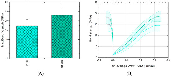 During loading, the monitoring of the tendon draw-in and -out showed a nearly constant increase up to approximately 75% of the final loading. Afterwards, the slip increase accelerated progressively until failure. After that, the tendons were further pulled-out until the remaining pull-out load stabilized on a much lower load level. All 12 samples tested failed by a sudden slip-out after reaching their maximum bond strength. The failure happened in the same manner as all other samples with the same coarse-sand-epoxy coating tested previously. The maximum bond strength means, ranging between 17.33 and 22.92 MPa for 7 and 28 d, respectively, are visualized as a whole in Figure 7A. Even though the maximum bond strength values look different at first glance, no significant difference neither a trend could be detected for the different dates of testing by statistics. Thus, the maximum bond-strength averaged over all samples of this test series is 20.13 MPa. The visualization of the corresponding τ-δ curves in Figure 7B is based on sensor data. Again, in these figures, the mean values of the tested samples and their standard deviation are visualized.
