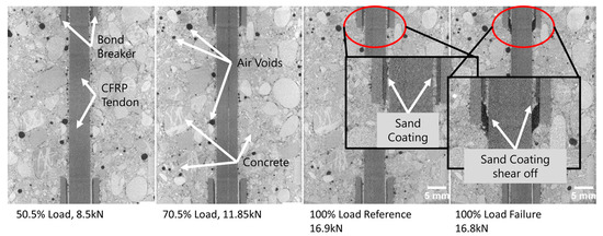 To gain more information of the bond failure initiation and to detect possible internal cracks at low loads, one sample was investigated at different load levels by X-ray CT. This sample was loaded in the same manner as all other tested samples to the following load levels: 50.5%, 70.5%, 100% no failure and 100% including failure. After reaching each level, the load was released instantly and the sample was transferred from the pull-out test setup into the X-ray CT setup. This procedure was repeated after each loading and the generated X-ray scans (Figure 8) were analysed visually. Up to 100% of loading, neither slippage nor cracks could be detected with the given setup configuration. Only after loading the sample until its sudden slip-out failure, the tendon slip could be visualized and was clearly indicated in the interface between the sand-epoxy layer and the CFRP tendon (see right side of Figure 8). The loading until 100% was possible due to online monitoring of the tendon draw-in. As visualized in Figure 7B, the tendon draw-in rate rapidly increases before failure. At this point, the loading was stopped and immediately released manually.