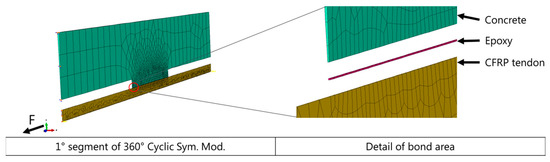 The structure of the implemented model is based on the idea of cyclic symmetry. To save computational cost, only a one-degree segment of a cylindrical pull-out prism is modelled. This is a simplification as the original prisms tested have a rectangular cross section. The FEM results show that the shear stress, transmitted from the tendon to the concrete, decreases very fast in radial direction. Hence, the modelled pull-out behaviour is expected to be independent of the actual cross section of the concrete prism. The model consists of three different areas which are related to the main materials and assembled as shown in Figure 9. As found in the experimental work, the sand coating was never ripped out of the concrete prism. Thus, these particles are not modelled in detail and are consequently neglected. However, the bond between the sand coating and the CFRP tendon is modelled by a very thin layer of epoxy resin. The thickness of this layer was chosen according to light microscopy measurements and an explanation of this method can be found in the materials and methods section of this work. In this FEA, only the new coarse coating was considered for the comparison between UTS- and UHM-CFRP.