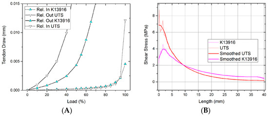Furthermore, the FEA was used to investigate the origin of the experimentally-found differences in the tendon draw-in for UHM and UTS tendons. For this purpose, only the CFRP material was changed, from K13916 (UHM) to a UTS CFRP, in the simulation. Without adapting any other parameters, such as epoxy material, concrete type or adhesive layer thickness, the FEA result already indicated the same behaviour as found experimentally. This is visualized in Figure 11B, in which the UHM CFRP tendon showed a higher tendon draw-in rate at low loads if compared to the UTS CFRP tendon. In addition, the experimentally-gained draw-in curve of the K13916 UHM CFRP tendon is plotted in the same graph as a reference.
