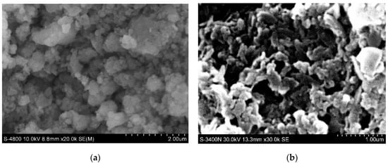 Scanning electron microscopy (SEM) of catalyst 1 (Figure 3a,b) shows the surface morphology of the catalyst, in which Figure 3a indicates that the amorphous catalyst with particle diameter of one hundred to several hundred nanometers, and each particle is consisted of several smaller particles with diameters of dozens of nanometers. These smaller particles with different shapes gather together irregularly, some micopores, cavums, and secondary channels which increase the surface area of the catalyst and provide enough space accessibly for substrates oxidant molecules in the catalytic active sites are clearer in Figure 3a. However, the catalyst treated in basic solution (Figure 3b) is relatively looser than that depicted in Figure 3a. From the SEM in Figure 3b, the particles of the base treated catalyst with diameter dozens nanometers are smaller, and the micropores, cavums and secondary channels are larger than that of in Figure 3a. Transmission electron microscopy (TEM) exhibits that the average diameter of these secondary channels among the layers of the catalyst is around 50 nm (Figure 4a,b). It is deduced that the inorganic Zirconium (ZrHPO4) parts of the catalyst that show layered structure at a nanoscale were enlarged and decomposed in basic solution (Figure 4b), and the special configurations of the catalysts could be beneficial to the substrates approaching the internal catalytic active sites easily and offer enough space for the epoxidation of olefins.