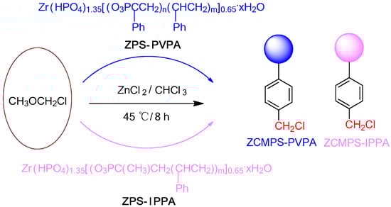 Chloromethyl methyl ether (8.22/12.5 g), anhydrous zinc chloride (1.6/1.25 g) and ZSP-PVPA/ZPS-IPPA (5.0 g) were mixed and stirred at 45 °C for 8 h. After cooling, a small amount of water and methanol was added into the mixture, filtered, washed with methanol and acetone, and dried in vacuo to obtain ZCMPS-PVPA, yield: 90.3%, IR (KBr cm−1): 3026, 2925 (CH), 2337 (O=P–OH), 1605, 1545, 1512, 1495 (–C6H5), 1271 (P=O), 706 (C–Cl) cm−1, ZCMPS-IPPA, yield: 92.3%, IR (KBr cm−1): 3028, 2920 (CH), 2328 (O=P–OH), 1602, 1540, 1511, 1490 (–C6H5), 1268 (P=O), 705 (C–Cl) cm−1.