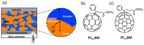 (a) Simplified schematic representation describing the main processes in a bulk-heterojunction solar cell device. The light absorption by the active layer (predominantly donor) generates excitons, which diffuses towards the donor-acceptor interface where they separate into free charge carriers (holes and electrons). Holes move towards anode and electrons move to the cathode. Chemical structures of fullerene-based acceptors (b) PC61BM and (c) PC71BM.