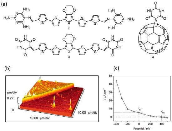 The incorporation of non-self-complementary hydrogen bonding motifs present in melamine/barbituric acid moieties is found to be an excellent tool to control the geometries of electron donors and acceptors. In 2005, Bassani and co-workers had for the first time incorporated molecular recognition motifs based on these moieties into thiophene oligomers using Schiff base formation or the Knoevenagel condensation reactions [49]. They synthesized two oligomers with central ethylenedioxythiophene (EDOT) core and 2,4,5,6-tetraaminopyrimidine (2) or complementary barbituric acid (3) at the ends as shown in Figure 3a. With respect to the parent oligomer (pentathiophene), 2 and 3 showed better solubility and lower oxidation potential due to the presence of central EDOT unit. Photovoltaic devices were fabricated using 2 as a donor and a complementary fullerene-substituted barbituric acid derivative (4) as an acceptor. The performance of the devices was evaluated in terms of open-circuit voltage conversion efficiency, Ф(VOC), and short-circuit quantum conversion efficiency, Ф(ISC). Initially, the oligomer 2 alone was tested for a photovoltaic response and the obtained values of Ф(VOC) and Ф(ISC) were 0.14 and 0.05, respectively. Atomic force microscopy (AFM) image of the self-assembled film is shown in Figure 3b. The I/V curve of photocurrent generated vs. applied potential was plotted as given in Figure 3c. Devices were fabricated under identical conditions using 2 (1 equiv.) in combination with two equiv. of either pristine C60 or 4. With reference to oligomer alone, two-fold increments in photocurrent were observed for the combination of 2/C60 and five-fold increment for the combination of 2/4. The better performance of 2/4 device could be attributed to the complementary H-bonding between the active components that granted extended organized domains, which helped in the charge separation and transport.