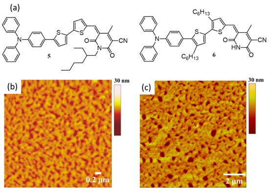 Use of electron deficient, self-complementary hydrogen-bonding units incorporated as an acceptor in “push–pull” p-type small molecules were proposed as another method to enhance the efficiency of photovoltaic devices. Kumar and co-workers have reported a comparison study of two such donor–acceptor small molecules, 5 [50] and 6 (without and with self-complementary hydrogen-bonding units), as given in Figure 4a [51]. Both molecules possess cyanopyridone moiety as the acceptor motif, where the nitrogen is alkylated with a 2-ethylhexyl substituent in 5, which masks the possibility of self-assembly while it is free or unmasked in the case of 6. The formation of interconnected nanostructures of 6 was confirmed by AFM and 1H NMR analysis. AFM images of films prepared from 1 and 10 mg/mL chloroform solutions of 6 (Figure 4b,c) revealed the formation of interconnected fibrous nanostructures of ~85–110 nm in width. The UV-visible absorption spectra of a thin film of 6 show blue-shift of the absorption peak (30 nm) in comparison with the solution state indicated the formation of H-aggregates. Upon fabrication of BHJ cells using 1:1 mixture of donor and acceptor (PC61BM), 6 gave an efficiency of 2.40% at a concentration of 10 mg/mL, whereas, 5 yielded an efficiency of 2.25% at a higher concentration of 20 mg/mL. It was assumed that the hole percolation to the electrodes facilitated by the one-dimensional chains of 6 formed through hydrogen bonding created networks, resulting in an increase in PCE.