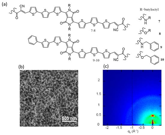 An example to explain the ability of an amide group to provide hydrogen-bonding and a second driving force for self-assembly beyond pi-pi stacking was emphasized by the research group of Stupp in 2015 [52]. They have synthesized symmetric (7, 8) and asymmetric (9, 10) donor molecules (Figure 5a) to study the effect of H-bonding on the active layer morphology. Devices from 7 to 8 were fabricated from chlorobenzene (CB) using PC71BM as the acceptor with a blend ratio of 1:1. A poor efficiency value of 1% was observed for both molecules due to the formation of large aggregates (~100 nm), which limited the exciton diffusion to the interphase. Interestingly, devices made from asymmetric derivatives were better than the symmetric counterparts; PCE of 9 and 10 were 3.65 and 1.45%, respectively. In addition, the effect of solvent additives such as 1,8-diiodooctane (DIO) and nitrobenzene (NB) on device performance was also studied. The NB addition to 9 gave the best PCE of 4.57%. The performance enhancement upon addition of NB was due to the formation of more interconnected domains, as evident from the transmission electron microscopy (TEM) image (Figure 5b), which resulted in the decrease of shunt resistance and an increase of hole mobility. The pi-pi stacking played no role in 9 as confirmed from two-dimensional grazing incidence X-ray diffraction (2D-GIXRD) (Figure 5c) and hence, hydrogen bonding was solely responsible for the improvement in PCE.