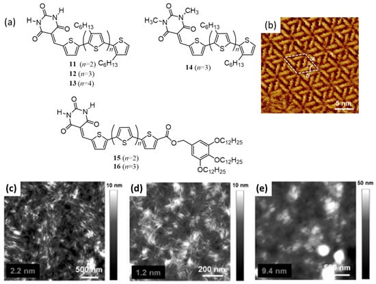 It was well established that H-bond assisted self-assembly of barbiturate-conjugated pi-systems has the ability to form supramolecular rosettes, which on further stacking form highly ordered nanorods. Utilizing this idea, Yagai et al. in 2014, reported the self-organization and photovoltaic properties of barbiturate-conjugated thienyl-[oligo(hexylthiophene)]s derivatives (11–13; Figure 6a) [53]. The STM images of the molecules at the liquid-solid interface of 1-phenyloctane and highly oriented pyrolytic graphite (HOPG) revealed well-resolved two-dimensionally organized rosettes consist of six units aggregated by multiple H-bonds (STM image of 13 is shown in Figure 6b). The rosettes on further self-assembly through pi-pi stacking results in highly ordered nanorods. As cast BHJ films consist of the nanorods and PC61BM showed PCE of 1.38%, 0.97% and 1.49% for 11, 12 and 13, respectively. Interestingly, the devices of 12 showed a remarkable improvement of the photovoltaic performance upon increasing the annealing temperature from 50 to 80 °C (PCE from 0.83% to 2.1%) due to the betterment in the film morphology (Figure 6d) when compared to that of 11 and 13 (Figure 6c,e, respectively). Further improvement in PCE of 12 (3.01%) was achieved by using PC71BM. To confirm that the design was appropriate, the authors made derivatives with a non-hydrogen bonded reference molecule (14) and derivatives possess long aliphatic chains (15, 16). The performances of these molecules were far less than that of the other three derivatives.