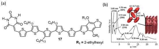 (a) Chemical structure of 17 synthesized by Yagai et al. [54]. (b) PXRD patterns of bulk samples of 17/PC61BM at 25 °C. Adapted with permission from Ref. [54] Copyright 2016 The Royal Society of Chemistry.