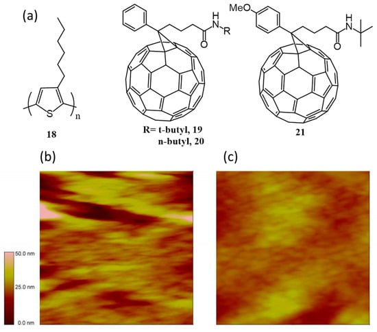 In order to improve the phase separation of fullerene acceptor with a polymeric donor such as poly(3-hexylthiophene) or P3HT (18), Li et al. have designed and synthesized PC61BM analogues containing hydrogen bonding amide groups (19–21; Figure 8a) [55]. All the three derivatives were functionalized with amide group in the place of ester group of PC61BM, while in the case of 21 there is an additional methoxy group. Devices were made with 18/fullerene derivative (1:4 w/w), and among the three, 21 gave an efficiency of 0.45%, while the reference PC61BM gave an efficiency of 0.42%. It was concluded that both fullerene derivatives have similar phase segregation scale. But upon annealing, amide fullerenes gave PCE almost zero, while PC61BM achieved an efficiency of 1.55%. As annealing was ineffective to amide fullerenes, the authors added 2.5% of 1,12-diiodododecane to the mixed solution of 18/fullerenes. However, the efficiency of devices made from amide fullerene derivatives did not improve, while the performance of PC61BM based devices enhanced to 1.77% under similar conditions. AFM images of the active layer confirmed that 1,12-diiodododecane could not prevent the unfavorable aggregation nature of amide methanofullerene derivatives resulting in large phase separation (Figure 8b,c).