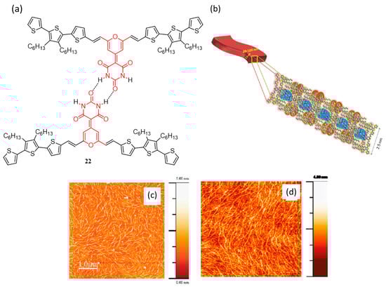 The effect of self-assembly induced by the cooperative hydrogen bonding and pi-pi stacking on the photophysical properties and the film morphology of an oligothiophene derivative (22; Figure 9a) was studied by Satish Patil et al. in 2011 [56]. The oligomer had a donor-acceptor-donor (D-A-D) structure with pyran-barbituric acid as the central core. H-bonding and pi-pi stacking interactions were induced by barbituric acid moiety and oligothiophene units, respectively. Due to the cooperative effect, the oligomer was able to form nanoribbons (Figure 9b) in the presence as well as in the absence of PC61BM as observed from AFM (Figure 9c,d, respectively). The authors have also made a non-hydrogen bonding model compound which did not form nanoribbons. The hole mobility of 22 was found to be ~7 × 10−7 cm2·V−1·s−1, measured using an organic field effect transistor (OFET) device architecture. The blend film of 22 with PC61BM (1:1 ratio) showed a maximum photovoltaic efficiency of 0.18%.