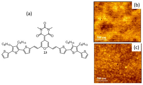The same group has synthesized another D-A-D type pi-conjugated oligomer (23, Figure 10a) with an aim to improve the solar cell efficiency [57]. As mentioned above, 22 consists of an acidic N–H proton and electronegative C=O that assist in self-assembling via hydrogen bonding. On the other hand, the hydrogen bonding is disrupted in the case of 23 by the introduction of a methyl group. Though 22 formed nanoribbons as mentioned above, films of 23 (pristine and blend) were homogeneous without any phase segregation (Figure 10b,c). Importantly, the photovoltaic device made from 23 gave an efficiency of 1.8%. The poor performance of 22 was attributed to the formation of nanoribbons which resulted in phase segregation with PC61BM. These results imply that prevention of H-bonding helped in developing better interdigitating networks which in turn enhanced the PCE. The reduced connection between the cathode and the active layer, due to an insulating layer formation by the reaction of acidic amide proton with calcium in the device was another reason for the poor performance of 22.