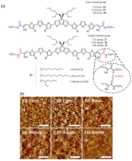 Another example to establish the fact that amide groups exhibiting strong H-bonding negatively affecting the solar cell efficiency was reported by Kim et al. They made six dithienosilole-based donors (24–29) consisting of different end groups (esters and amides) and alkyl side chains (n-octyl, n-decyl, and 2-ethylhexyl chains) as shown in Figure 11a [58]. Detailed studies showed that the optical properties of the molecules were affected by the alkyl side-chains as well as the end-functional groups. The absorption maximum of the thin films of the molecules was shifted bathochromically by 50–80 nm, due to the planarization of the conjugated backbone except in the case of 29 which showed 7 nm blue-shift. The effect of temperature on the charge carrier mobility properties of the molecules was studied at temperatures between 80 and 280 K using field-effect transistor device architecture. It revealed an increasing mobility trend in the order 25 > 24 > 28 > 27 > 26 > 29. It was found that the H-bonding results a decrease in the planarity of the conjugated backbone, as a result, more energy was required for charge transport in amides when compared to esters. This poor charge transport property was well reflected in photovoltaic performance too; 29 exhibited extremely low efficiency (0.21%) among all, while 24 performed best and had a PCE of 4.31%. The PC61BM blend with esters (especially 24 and 25) yielded good BHJ morphology consisting of small domain of 20–30 nm (RMS roughness of 2.7 nm). This contributed to the efficient separation of the excitons and facilitated the charge transport, leading to high PCEs. On the other hand, blends of 27 and 28 with PC61BM showed less distinct features in the morphology with much lower roughness values (~0.5 nm) due to the enhanced miscibility. Blend film of 29 lacks a clear interface, which resulted in the poor performance of the device. AFM images of all the blend films are shown in Figure 11b.