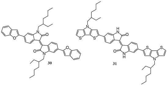 Molecules possessing free imide groups also have an adverse effect on the photovoltaic performance due to the formation of strong intermolecular hydrogen bonding as demonstrated by Roncali and co-workers [59]. Two donors 30 and 31 with a D-A-D structure involving isoindigo (IsI) as a central acceptor block and benzofuran (30) and dithienopyrrole (31) as a side donor unit were synthesized (Figure 12). The molecule 31 has a free imide group in the center and therefore, able to form intermolecular hydrogen bond while such an interaction is absent in the case of 30 as the nitrogen atom is alkylated. BHJ devices were prepared by spin-casting active films from a chlorobenzene solution of donor/PC61BM (1:2 w/w). 31 performed least (0.01%) as the hydrogen bonding locks the molecules into an unfavorable organization. However, planar heterojunction devices yielded PCE of 0.19% which decreased upon thermal annealing. On the other hand, 30 yielded a PCE of 0.15% which increased on annealing at 110 °C to 0.65%.