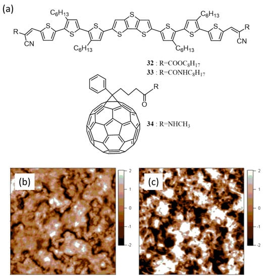 In 2014, Wong et al. reported the synthesis of two oligomers, one with ester (32) and the other with amide (33) end groups [60]. They synthesized a fullerene derivative with amide functionality (34) for comparison and also to investigate the utilization of hydrogen bonding self-assembly as a tool to control the morphology. The chemical structures of the oligomers and the fullerene derivative are shown in Figure 13a. UV-visible absorption studies revealed that the absorption maximum of 32 is more red-shifted than 33. This was attributed to the presence of better electron withdrawing property of the ester group as compared to the amide. An amide hydrogen bonding in the case of 33, disrupting the close pi-pi stacking between the planar conjugated back bone of the oligomer was also contributed to this effect. The absence of pi-pi stacking in 33 was supported by gracing incidence wide angle X-ray scattering studies. The AFM images of the oligomers revealed that 33 were able to form a fibrous structure which is beneficial for charge transport in BHJ, Figure 13c. However, devices fabricated using 33 performed poor, mainly due to unfavorable morphology induced by inter-molecular hydrogen bonding. Hole mobility calculated by space charge limited current (SCLC) method for 32 and 33 was found to be 6.3 × 10−6 and 1.1 × 10−6 cm2·V−1·s−1, respectively. BHJ devices fabricated with PC71BM and 32 (1:2) gave an efficiency of 1.15%, whereas, PC71BM and 33 (1:4) gave an efficiency of 0.40%. Stronger aggregation and large-scale phase separation were seen with 34 as the acceptor resulting in much lower efficiencies.