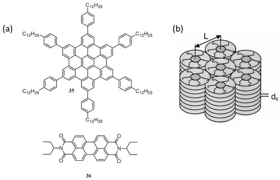 Chemical structures of 35 and 36 synthesized by Müllen et al. [61] and Schön et al. [62] respectively; (b) A simplified representation of the pi-pi stacking of the discotic molecules, where, L is the intercolumnar distance and dc is the co-facial distance. Adapted with permission from Ref. [63] Copyright 2001 The American Association for the Advancement of Science.